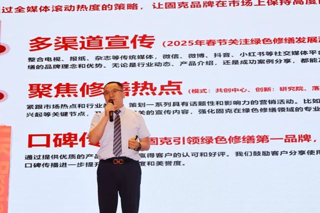 固克节能品牌中心总监马林先生回顾固克 24 年发展历程时强调,固克在绿色修缮领域勇立潮头,以行业领军之姿铸就绿色修缮第一品牌。不仅成立业内首家绿色修缮创修研究院、绿色修缮商学院,还围绕绿色修缮夯实 200 多项专利、推广核心产品,以创新驱动行业发展。面向市场,固克推出三项重磅政策 —— 绿色修缮共创中心加盟政策、工业建筑合作政策、项目揽新锁价政策。这些利好政策旨在深化与合作伙伴的共赢关系,通过资源共享与优势互补,共同抢占建筑市场发展先机。