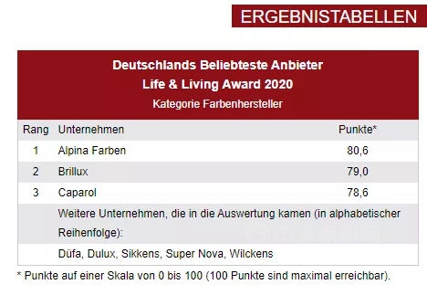 基于在线调查的形式,对公司的总体满意度,及产品或服务质量等方面进行打分,Alpina以80.6的支持率在油漆制造商中位列第一。