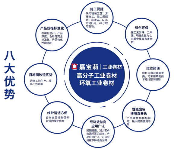 同时嘉宝莉高分子工业地板属于预制成品,对旧地面无需进行大力度改造即可进行铺装,施工效率大大提升。