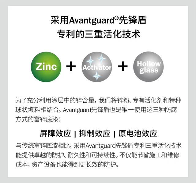 与传统环氧富锌漆不同的是,Avantguard先锋盾技术可激活涂层中的锌含量,从而大大提高产品的防腐性能和机械强度,且易于施工。这意味着该产品施工更准确且施工时间缩短,同时还能保障高性能、让涂层更持久,并且降低未来的维护成本。