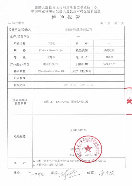 科创饰面板甲醛释放量未检出(检出限:0.005)