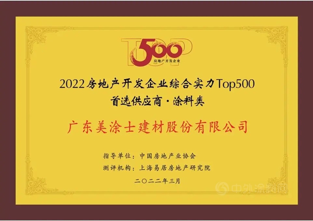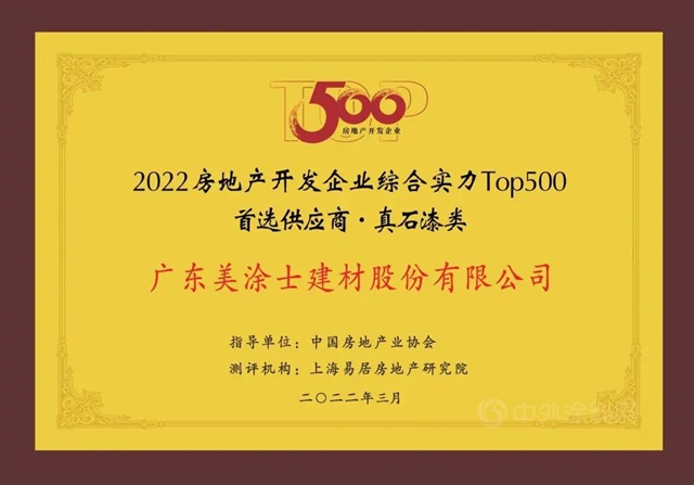 “新变局,新篇章”,3月29日,由中国房地产业协会、上海易居房地产研究院共同主办的2022中国房地产500强测评成果发布会暨房地产高峰论坛在北京国贸大酒店盛大召开,美涂士实至名归,连续8年蝉联国房地产开发企业综合实力TOP500 首选供应商。