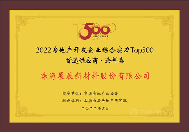 3月29日,2022中国房地产TOP500测评成果发布会暨房地产高峰论坛在北京国贸大酒店隆重举行。会上发布了《2022中国房地产开发企业综合实力TOP500首选供应商测评研究报告》,展辰新材·经典品牌获评“2022房地产开发企业综合实力TOP500首选供应商·涂料类”。