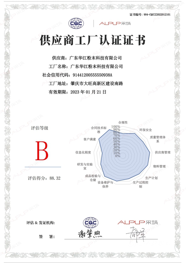 采筑严选供应商通过聘请第三方专业机构对于公司的产品进行专业测试,从多个维度对供应商进行审核和评估而出,千江旗下广东华江粉末科技有限公司综合评分88.32分,获B级认证。