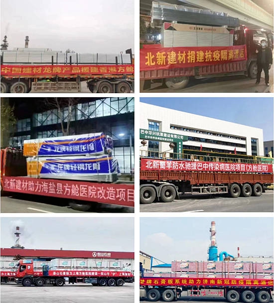 北新建材驰援中央援港应急医院项目和中央援建香港社区隔离设施项目建设,泰山石膏驰援上海和大连方舱建设,梦牌新材料支援济南新冠防疫隔离酒店项目建设,北新防水援建沈阳、长春、上海等地抗疫工程……据统计,自新冠肺炎疫情发生以来,北新建材驰援抗疫医院、隔离点建设涉及11省(直辖市、特区),逾120家。而这背后,是北新建材人克服当地静态管理、物流通道受阻,以及资源需多方协调等重重困难,与疫情竞速而创造的时间奇迹。
