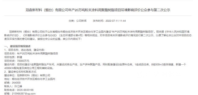 7月11日冠森新材料(烟台)有限公司官网发布消息,公司将在烟台化学工业园内建设“年产20万吨粉末涂料用聚酯树脂项目”,目前项目正在进行环评的二次公示。