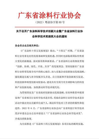 为全面推进《广东涂料十四五发展规划》各项目标的顺利实施,强化核心上下游卡脖子技术和关键技术攻关,大力推进涂料行业理论创新、技术创新、机制创新,广东省涂料行业协会定于2022年11月底召开“广东涂料科学技术创新大会”,同期举行广东省涂料行业协会科学技术奖颁奖大会。