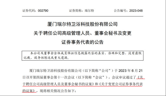 6月21日瑞尔特发布公告称,公司董事会同意聘任童华辉担任公司副总经理,任期自董事会审议通过之日起至第四届董事会任期届满时为止。