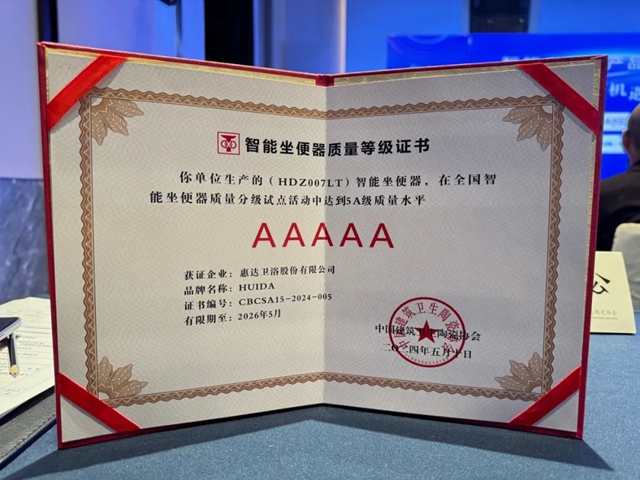 经过数月严格的测试和评估,惠达卫浴的007全智能马桶凭借其卓越的性能和出色的品质,荣获了质量分级5A级评价,达到国际领先水平,并获得了由中国建筑卫生陶瓷协会颁发的荣誉证书。这一殊荣不仅彰显了惠达卫浴在智能卫浴领域的领先地位,也为中国智能卫浴产业的持续发展树立了新的标杆。